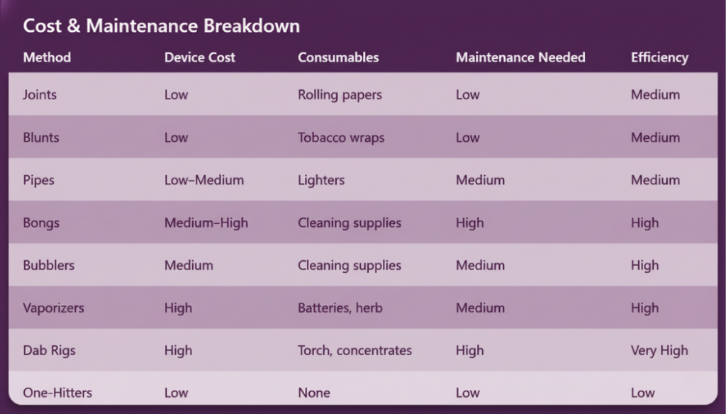- Methods vary in THC absorption, flavor, cost, and maintenance